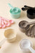 多種顏色可選擇,手柄處標有明確的容量標示,並配有導流口設計,方便傾倒液體或粉末食材。每組皆附帶專屬扣環,可將量匙與量杯分別串連,確保存放時整齊有序且不易遺失。